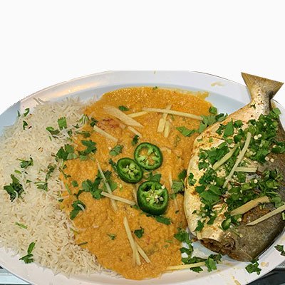 Boneless fillet of Pomp deep-fried, served with long grain basmati white rice, and Daal Fry.
