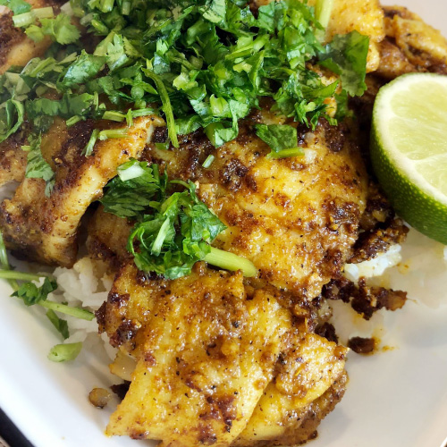 Boneless fillet of fish marinated overnight in 10 different spices, grilled over charcoal and garnished with cilantro, ginger, jalapenos and sprinkled with our special masala.