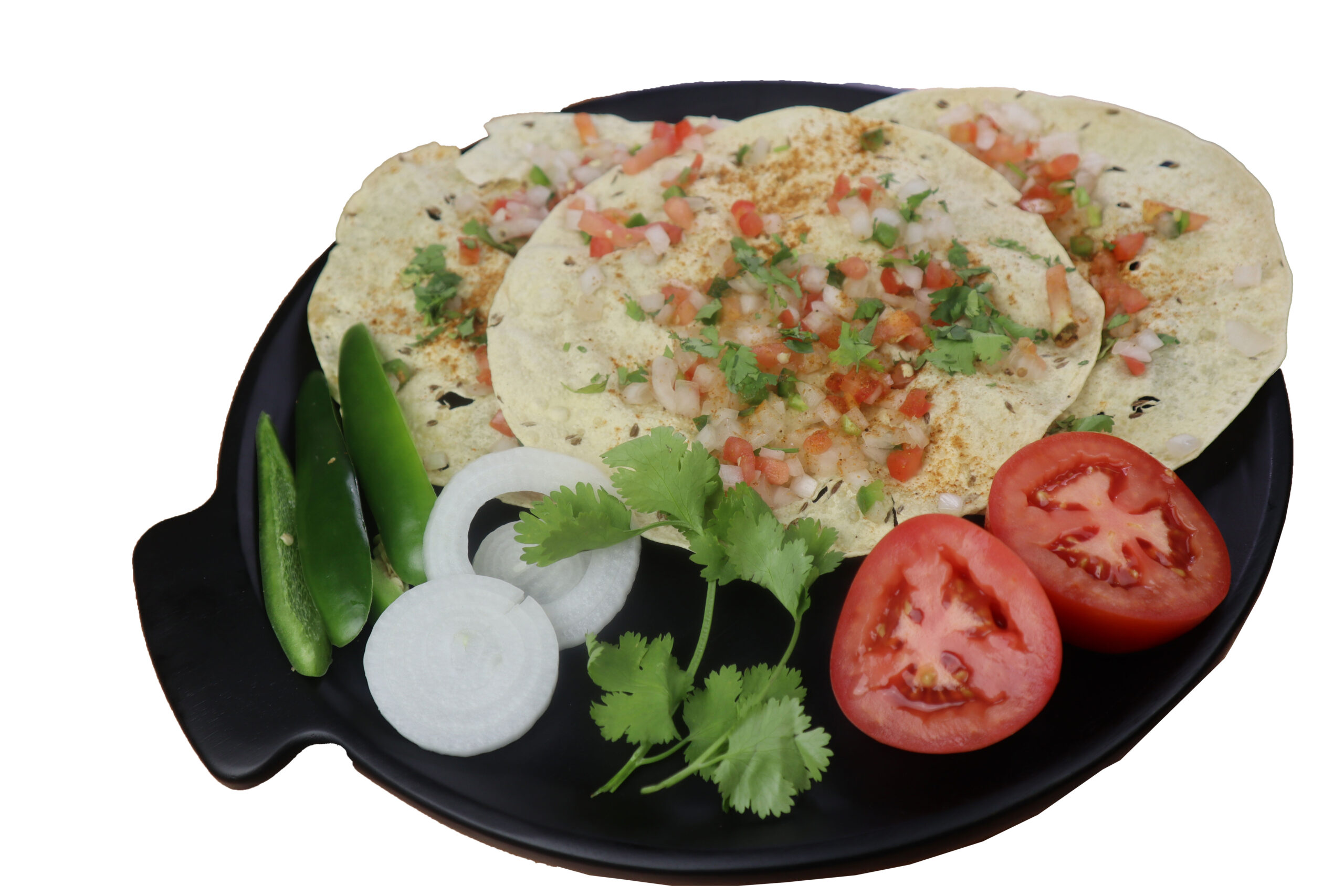 Deep-Fried, a thin, crispy, round flatbread made of seasoned dough from peeled black gram flour with cumin seeds, sprinkled with diced onions, tomatoes, jalapenos, and masala.